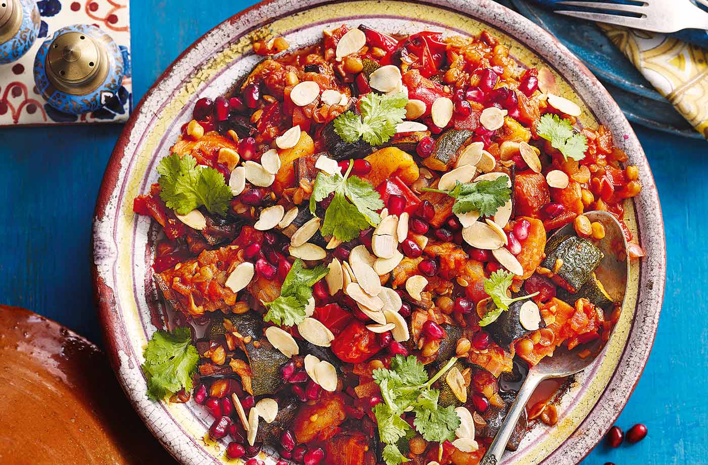 Divide the couscous between 6 bowls. Top with the tagine and garnish with the coriander leaves, almonds and pomegranate seeds (if using).